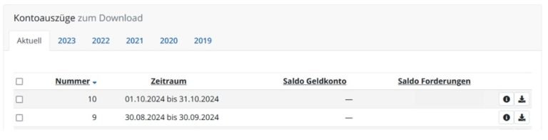 Wählen Sie den Menüpunkt „Konto“ – „Kontoübersicht“ aus. Dort stehen Ihnen sämtliche Kontoauszüge je Konto, nach Jahren sortiert, zum Download zur Verfügung.