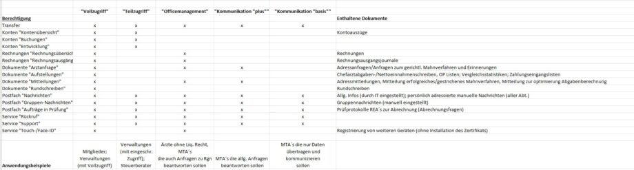 Grundsätzlich können verschiedene Berechtigungen für Ihre Praxis oder Einrichtung vergeben werden. Wir empfehlen eine klare Rollenvergabe, damit jeder genau die Zugriffsrechte hat, die er benötigt. So bleibt alles sicher und übersichtlich. Im Folgenden sehen Sie dazu die Aufstellung der verschiedenen Rollen und Berechtigungen von PVSconnect.